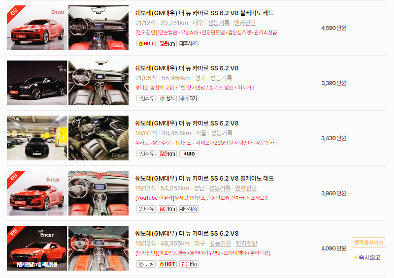 더 뉴 카마로의 경우 최신 연식일수록 가격대가 높으며, 전체적으로 3천만 원대부터 4천만 원대에 거래됩니다.