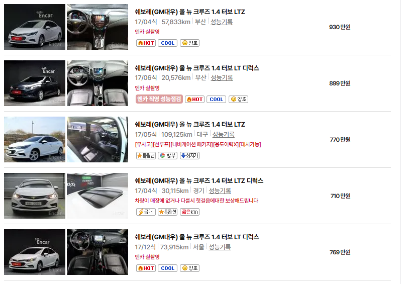 ✅ 아래에서 유지비가 저렴한 쉐보레 크루즈 중고차 실매물을 찾아 보세요.
