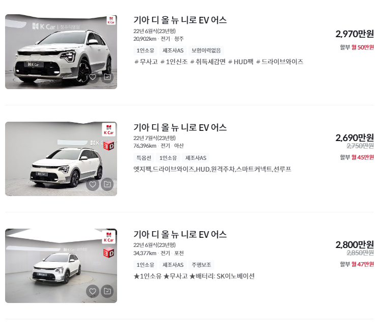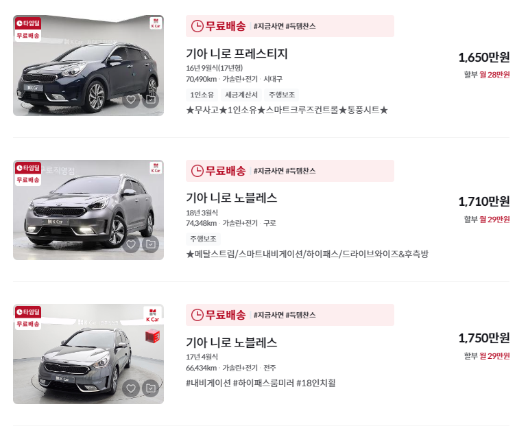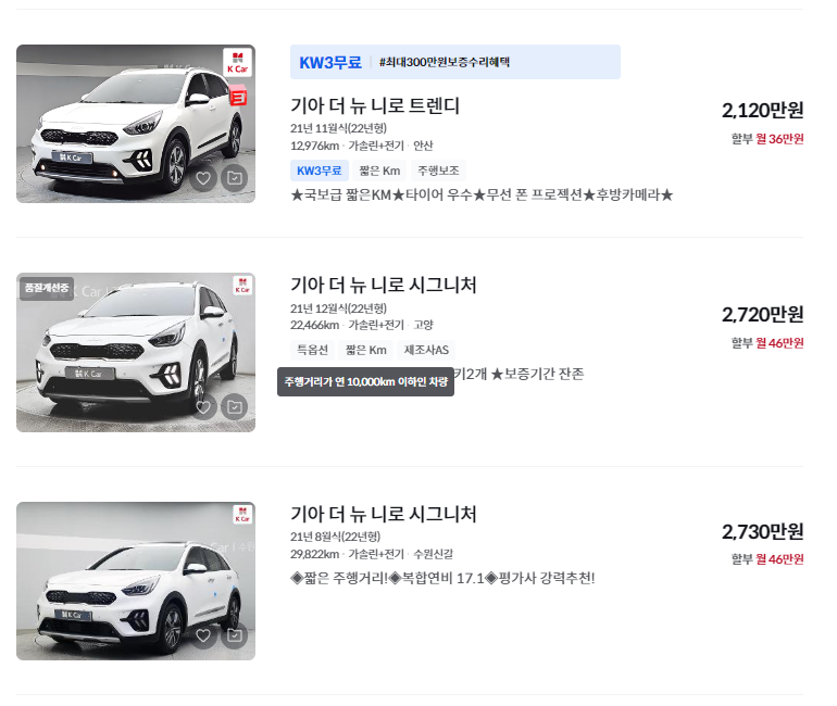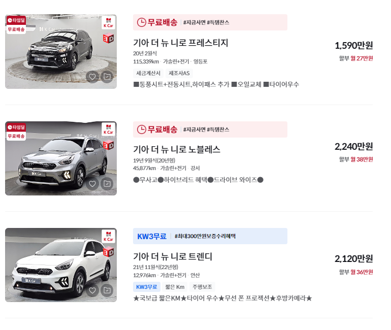 ✅아래의 우리나라 대표 중고차 매매 사이트인 kb차차차 , sk엔카직영몰 , 케이 카 직영 몰 에서 니로 중고차 실매물을 1분 만에 확인해 보세요.
