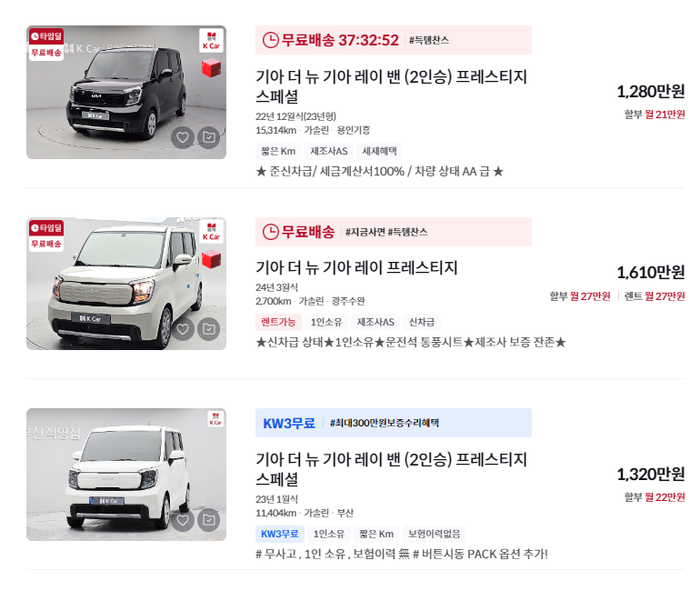 더 뉴 기아 레이(22년~현재)의 경우 최신 모델로 옵션과 상태에 따라 1,120만원에서 1,850만원까지 다양한 가격을 보입니다.