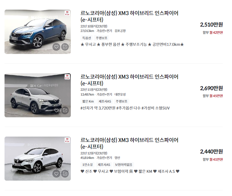 ✅아래에서 르노코리아 XM3 중고차 가격 및 시세표를 확인해보세요.
