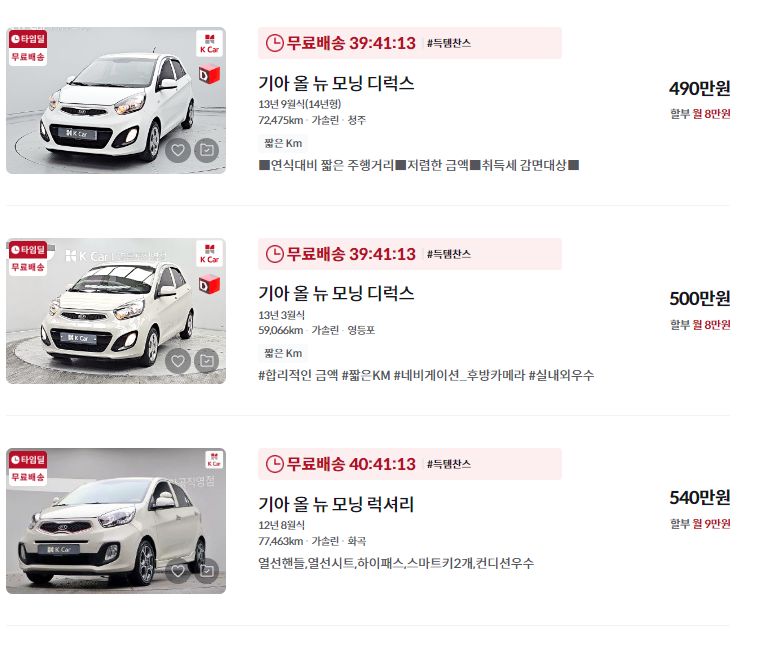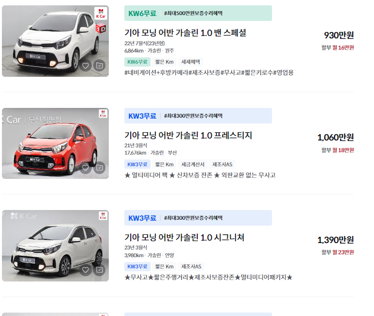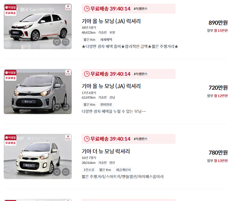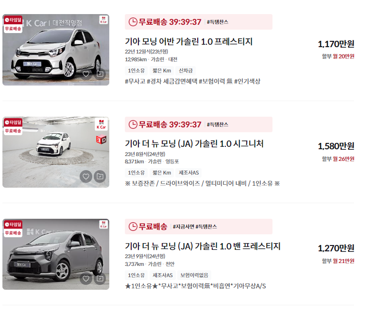 2021년부터 2024년까지의 모닝 중고차는 신차급 상태로, 1,000만 원 이상의 가격대가 형성되어 있습니다. 신차와 비교해 옵션이나 주행거리를 따져보며 합리적인 가격에 구매하는 것이 중요합니다.