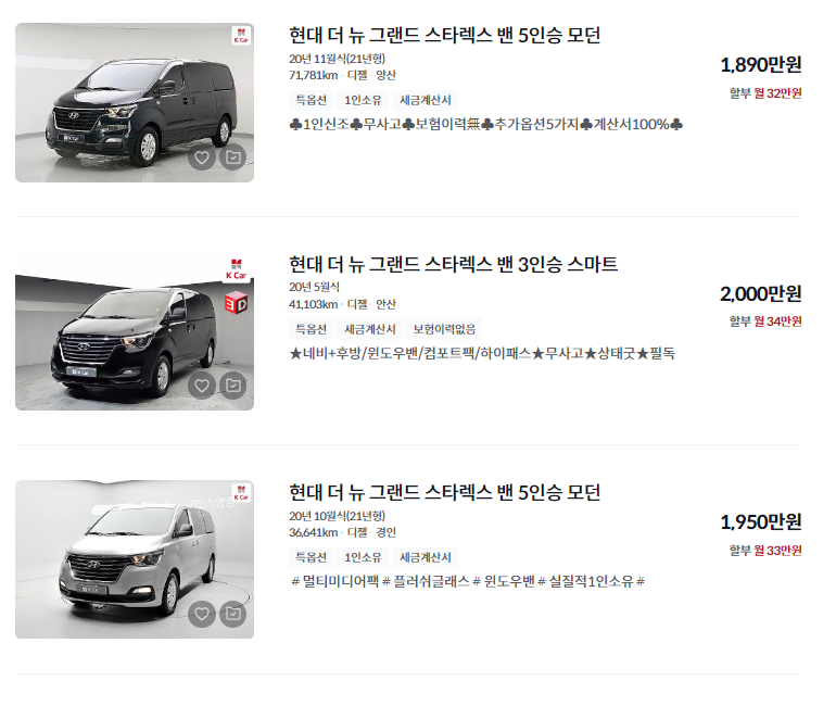 | 2021 | 더 뉴 그랜드 스타렉스 모던 | 2,300만 원 | 2,000만 원 | 2,500만 원 |