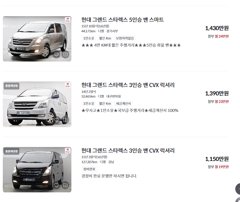 | 2016 | 그랜드 스타렉스 럭셔리 | 1,500만 원 | 1,200만 원 | 1,700만 원 |