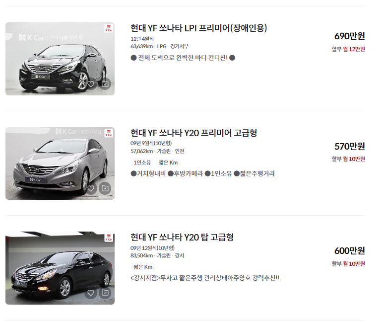 YF 쏘나타 중고차 가격은 500만원에서 900만원입니다. 이 모델은 기본적인 성능을 갖추면서도 유지비가 적고, 실용성이 뛰어나 많은 운전자들에게 사랑받는 차량입니다. 가성비가 뛰어난 모델로, 중고차 시장에서 꾸준한 수요를 유지하고 있습니다.